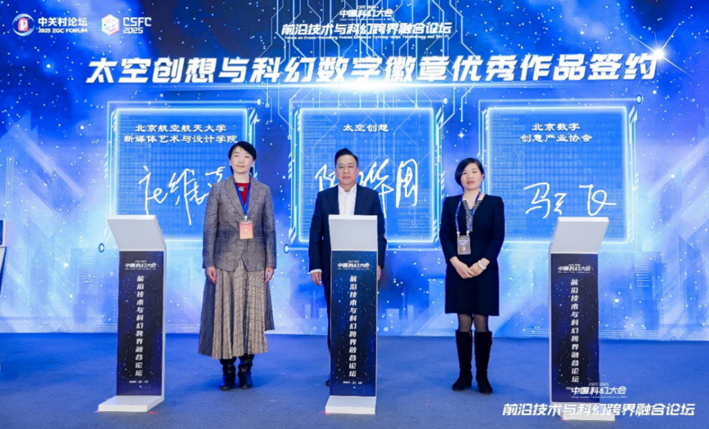 2025中国科幻大会前沿技术与科幻跨界融合论坛现场,“太空创想”品牌与北京航空航天大学科幻数字徽章优秀作品签约,围绕航天科技与数字艺术的深度融合展开合作,以前沿技术赋能科幻创作,推动航天科普与科幻产业协同发展。此次签约构建 “创作 – 孵化 – 传播” 全链条支持体系。标志着科技硬实力与人文想象力在科幻赛道开启创新实践,为青少年科技文化创新搭建新平台,助力中国科幻产业迈向新高度。
