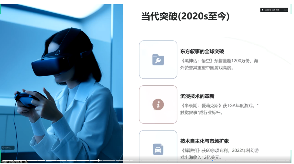 当像素点在示波器上勾勒出最初的 “乒乓” 轨迹,当《黑神话:悟空》的金箍棒划破虚拟与现实的边界,科幻游戏早已不止是指尖的娱乐—— 它是第九艺术的现代表达,是文化重构的试验场,更是技术与人文碰撞的火花。刘健老师带着我们穿越从 1950 年代的简陋演示到元宇宙构想的时光长廊,梳理了科幻游戏的发展脉络,更揭示了中国游戏产业从“换皮代工”到“全球领跑”的崛起密码。