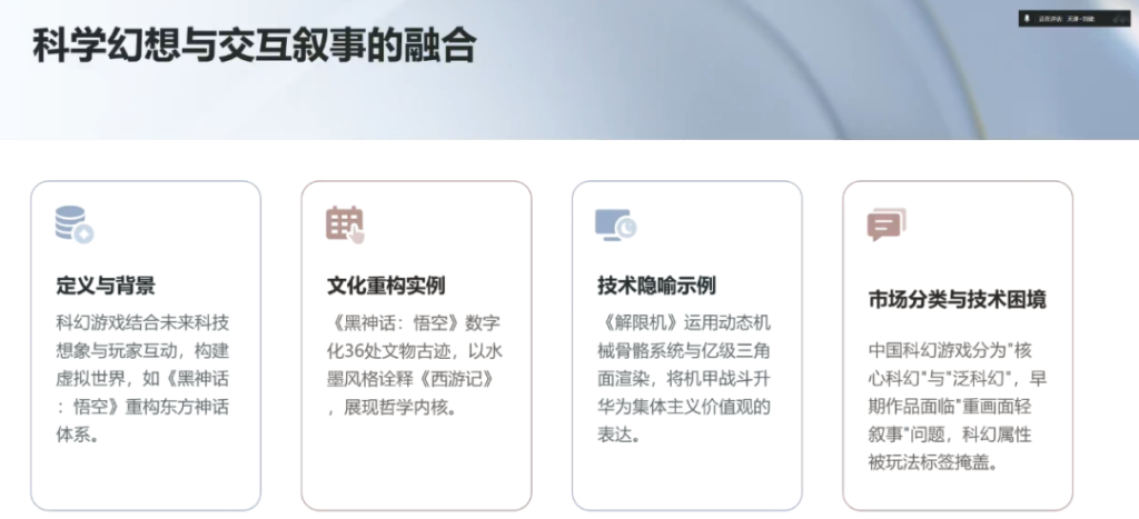 游戏的文化折扣率远低于影视。《黑神话:悟空》让海外玩家自发研读《西游记》,证明“好玩”本身就是最好的文化介绍信。刘建老师提醒:“面向国际市场时,不必纠结‘纯科幻’,和本土IP结合才能走得远。”西方将科幻、奇幻统称“推想文学”的传统,也为中国游戏的出海提供了思路。