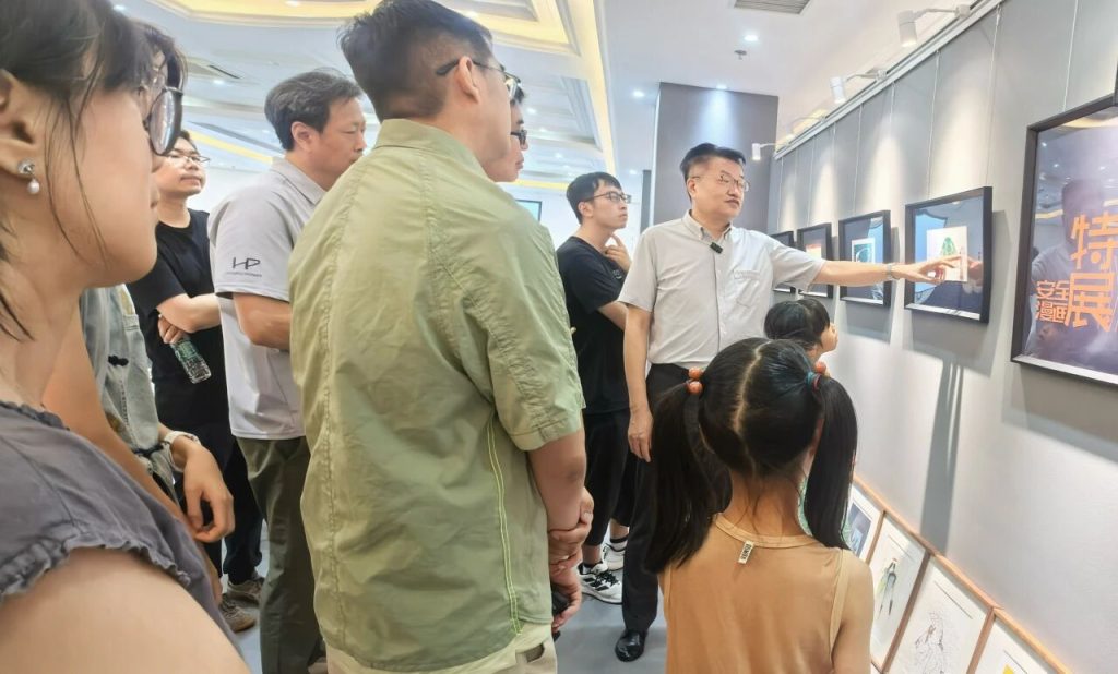 展馆另一侧陈列着日本漫画大师牧野圭一的作品。陶教授凝视画作,忆起往事:“2019年筹备中日青少年奥林匹克漫画交流展时,牧野先生刚经历胃切除大手术。当他现身现场,瘦弱得脱了形,却仍坚持拄拐前来。‘这是我们共同的事业,不能缺席。’他握着我的手,声音不大,字字清晰。”牧野先生拄拐的坚定身影和那句“不能缺席”,深深刻在陶教授心中——“那一幕,永志不忘。”